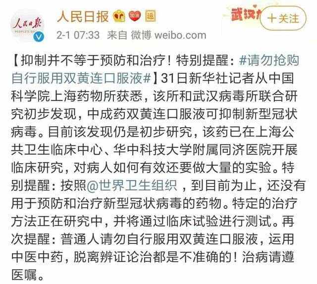 人民日报也赶紧出来辟谣:抑制并不等于预防和治疗,请勿自行服用双黄连口服液。按照世界卫生组织的表态,到目前为止,没有任何用于预防和治疗新型冠状病毒的药物。