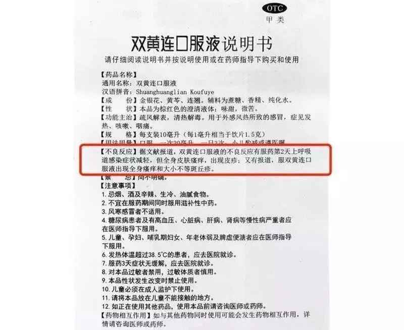 除注射剂外,口服液、颗粒剂等按照非处方药管理,可按说明使用或在药师指导下购买和使用。根据说明书记载以及不良反应监测情况,双黄连口服剂型不良反应可见皮疹、红斑、瘙痒、恶心、呕吐、腹泻等。