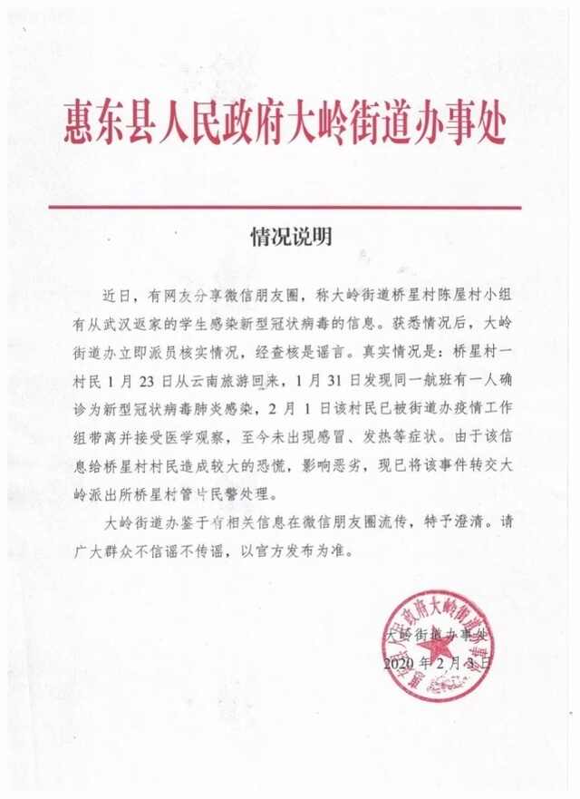 大岭街道办事处发布《情况说明》称,真实情况是:桥星村一村民1月23日从云南旅游回来,1月31日发现同一航班有一人确诊为新型冠状病毒肺炎感染,2月1日该村民已被街道办疫情工作组带离并接受医学观察,至今未出现感冒、发热等症状。