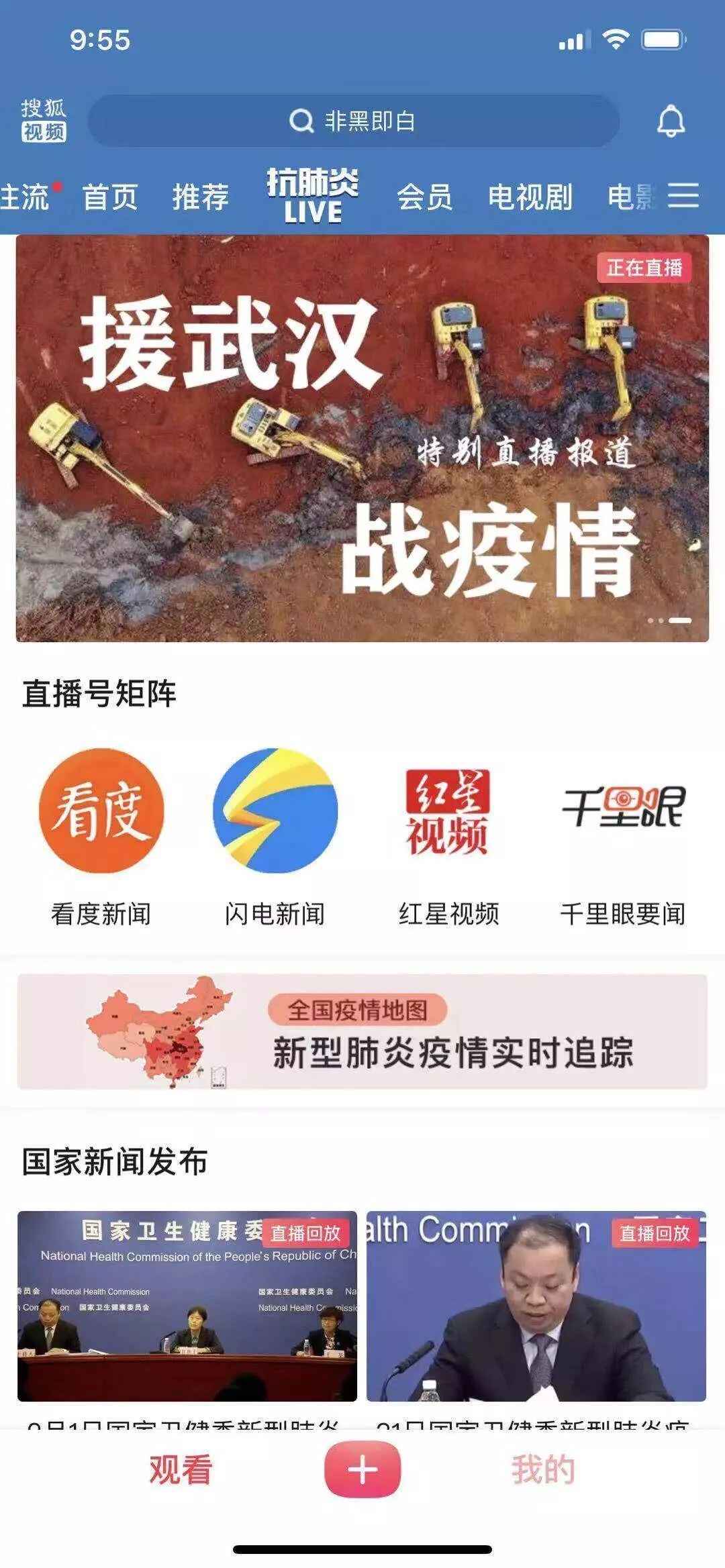 为了及时系统地传递疫情信息,搜狐视频战“疫”大直播,特设了“抗肺炎LIVE”专属板块,联合多家媒体机构24小时不间断直播疫情动态。公众网友不仅可以通过“新型肺炎疫情实时追踪”了解全国疫情地图,还可以观看如“央视新闻”等多家权威媒体的直播发布会,全天候、多元化的获取精准疫情信息。