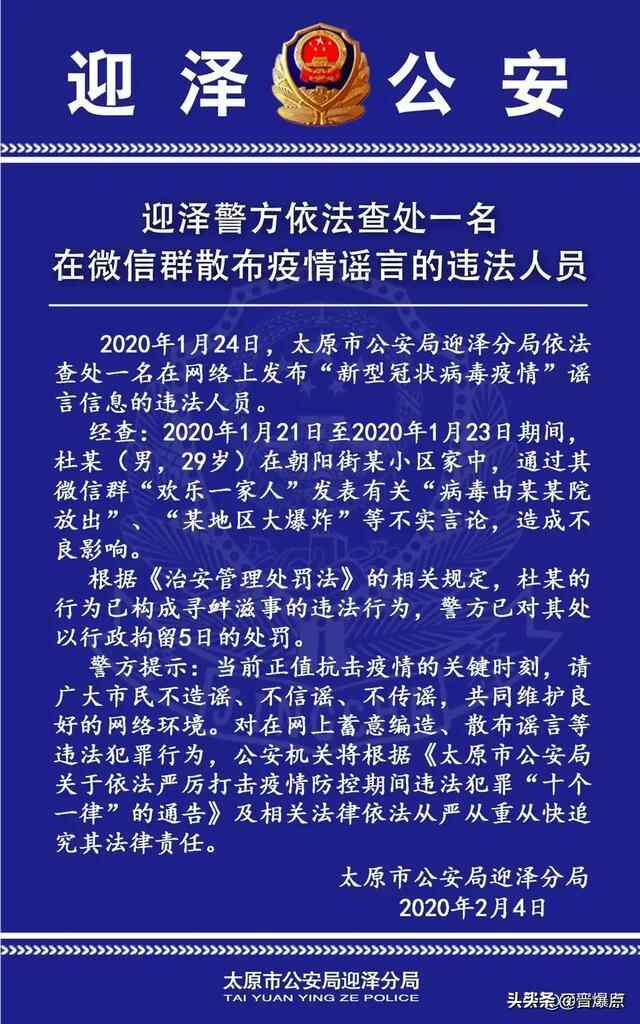 #太原# 【太原:一名在微信群散布疫情谣言的违法人员被查】2020年1月24日,太原市公安局迎泽分局依法查处一名在网络上发布“新型冠状病毒疫情”谣言信息的违法人员。 经查:2020年1月21日至2020年1月23日期间,杜某(男,29岁)在朝阳街某小区家中,通过其微信群“欢乐一家人”发表有关“病毒由某某院放出”、“某地区大爆炸”等不实言论,造成不良影响。 根据《治安管理处罚法》的相关规定,杜某的行为已构成寻衅滋事的违法行为,警方已对其处以行政拘留5日的处罚。 警方提示:当前正值抗击疫情的关键时刻,请广大市民不造谣、不信谣、不传谣,共同维护良好的网络环境。对在网上蓄意编造、散布谣言等违法犯罪行为,公安机关将根据《太原市公安局关于依法严厉打击疫情防控期间违法犯罪“十个一律”的通告》及相关法律依法从严从重从快追究其法律责任。(来源:平安太原)