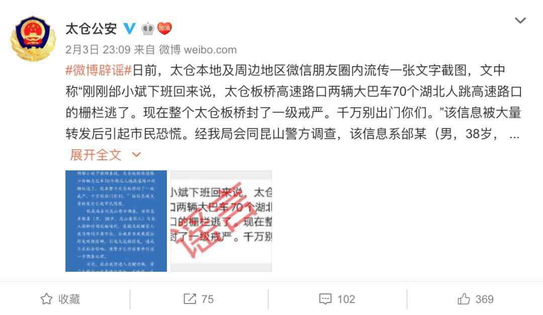 对此,记者求证获悉,中百仓储方面并未免费发放菜品,而是上午超市开门前,市民排队等候测量体温进店。 中百仓储相关负责人表示,中百仓储为武汉市抗疫保供单位,每日10:00-17:00时正常开门营业,商品供应充足。 最近,江苏苏州太仓本地及周边地区微信朋友圈内流传一张文字截图,文中称,“刚刚邰小斌下班回来说,太仓板桥高速路口两辆大巴车70个湖北人跳高速路口的栅栏逃了。”该信息被大量转发后引起市民恐慌。