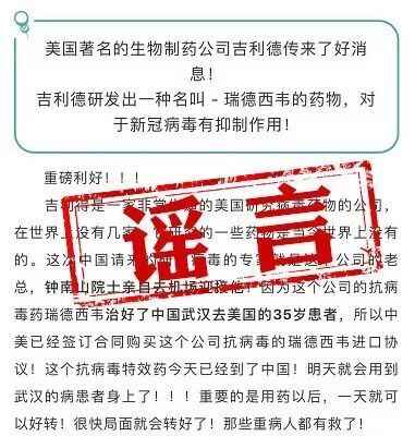 当下,新型冠状病毒感染的肺炎疫情非常受关注,各种各样的消息铺天盖地,相关部门积极发布各种信息的同时,也有不少谣言在网上流传。 下面这些消息已被证实为谣言↓↓ 网传“吉利德公司研发出对新型冠状病毒有抑制作用的药物,钟南山院士在机场迎接吉利德公司老总”。