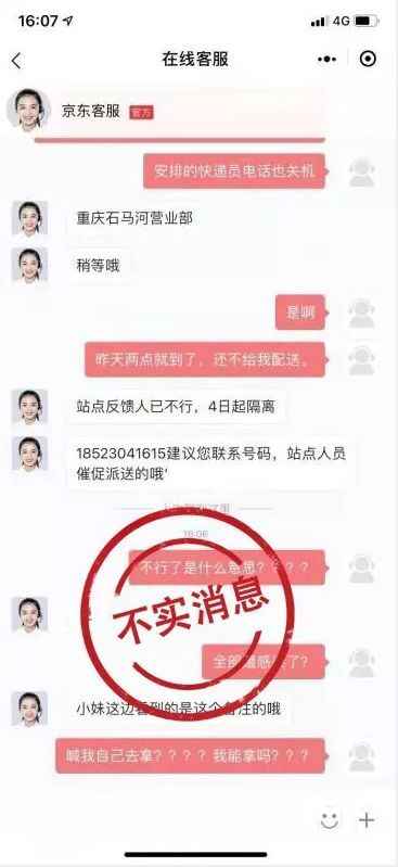 对此,该公司“京东快递小哥”账号回应称:该传闻系不实消息。经向有关管理部门和京东方面核查,该员工并未感染新型肺炎,也未感染流感,身体正常。该员工因调休,为交接工作,直接在社交签名上自我夸张表述为“隔离”,而客服人员未了解真实情况,直接将重庆石马河营业部(包括照母山片区经营范围)该配送员社交签名复制粘贴给顾客,导致不实消息产生。