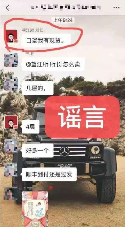 今日上午,万州某微信群里的群成员陈某在群中以“望江所所长”名义发布卖口罩信息,经调查,这位“望江所所长”真实身份为陈某(身份证号码5002361990****家住万州区清堰坡,无业),抗击疫情关键期,请各位网友擦亮双眼,不造谣、不信谣、不传谣。