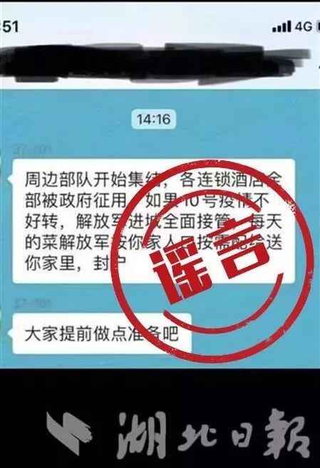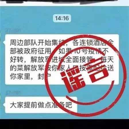 今日,有消息在网络和朋友圈流传称,周边部队开始集结,各连锁酒店全部被政府征用,如果10号疫情不好转,解放军进城全面接管, 每天的菜解放军按你家人口按需配给送你家里,封户。消息提示让居民早些准备。