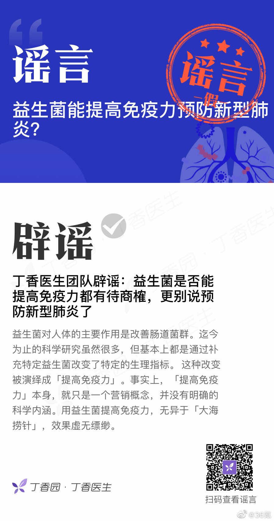 【#疫情辟谣# | 益生菌能提高免疫力预防新型肺炎?】 丁香医生团队辟谣:益生菌是否能提高免疫力都有待商榷,更别说预防新...