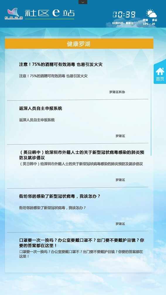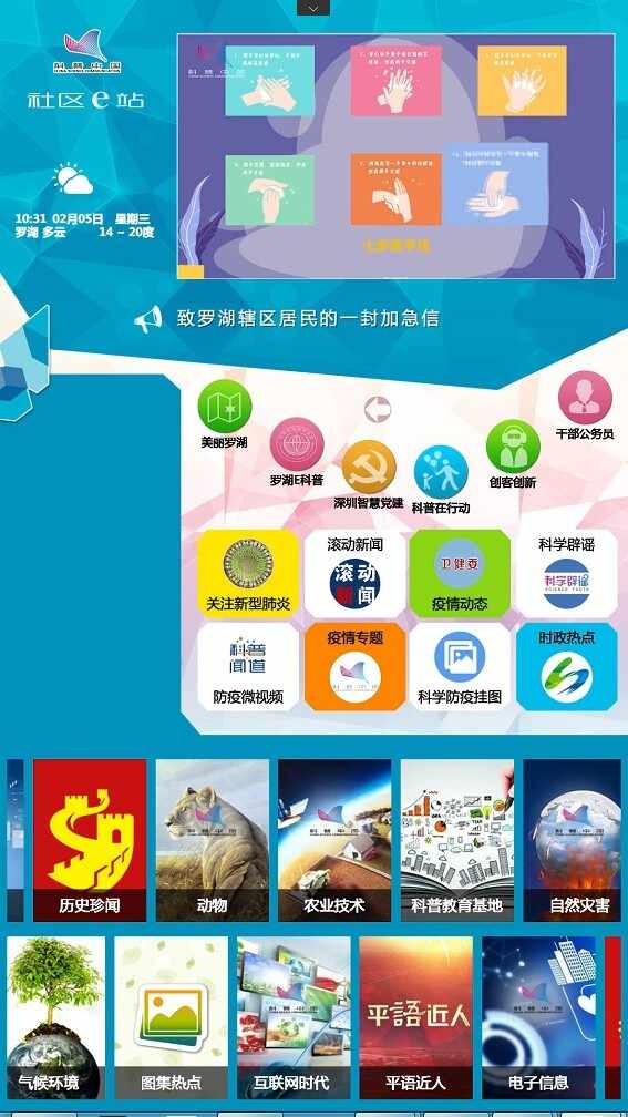 为做好新型冠状病毒感染肺炎疫情的防控工作,科学、准确、及时地向公众传播防治信息,最大程度的减少对公众健康和生命安全造成的危害,罗湖区科协充分利用辖区33个“科普e站”做好科普宣传工作,开展新型冠状病毒防治宣传和辟谣行动:一是新增7个疫情相关栏目。从1月21日起,新增了“关注新型肺炎”、“滚动新闻”、“疫情动态”、“科学辟谣”、“防疫微视频”、“科普中国防疫专题”、“科普防疫挂图”等栏目,转载来自国家卫健委、人民网、科普中国等相关权威网站的信息。据统计,截至2020年2月4日,累计转载卫健委、人民网、科普中国等权威发布文章593篇,挂图资料17组,轮播窗口播放23组,日均播放500分钟。二是结合权威信息制作科普微视频。结合最新动态,与联著实业公司共同制作科普微视频,做到每天至少更新1部,如“解读《新冠肺炎心理干预指导原则》”“双黄连口服液可抑制新型冠状病毒?”“上班后该如何做好防护”等科普微视频,至今已更新了36部微视频。三是通过“时政热点”、“健康罗湖”等栏目,转载罗湖政府在线、罗湖家园网等动态,让社区居民及时了解身边最新情况。此外,及时在各微信工作群转发政府部门及权威媒体关于新型冠状病毒的相关内容,普及健康教育科普知识,呼吁公众理性科学对待新型冠状病毒感染的肺炎,避免因信谣传谣而引发不必要的恐慌。