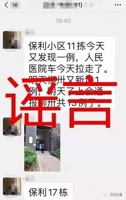 经核实,柳北区保利大江郡小区并无人因确诊感染新型冠状病毒被人民医院拉走,故以上图片信息均为谣言,请广大市民不必恐慌,不要传谣!