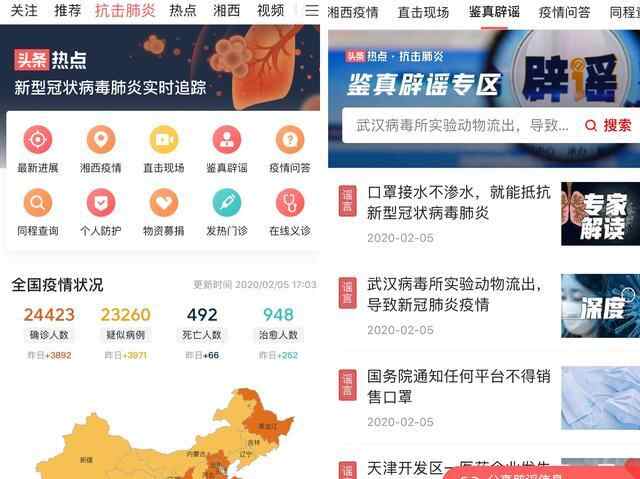 同时,平台现已上线抗击肺炎-鉴真辟谣模块,会对相关谣言进行实时辟谣,打开今日头条APP,选择“抗击肺炎”频道即可看到。