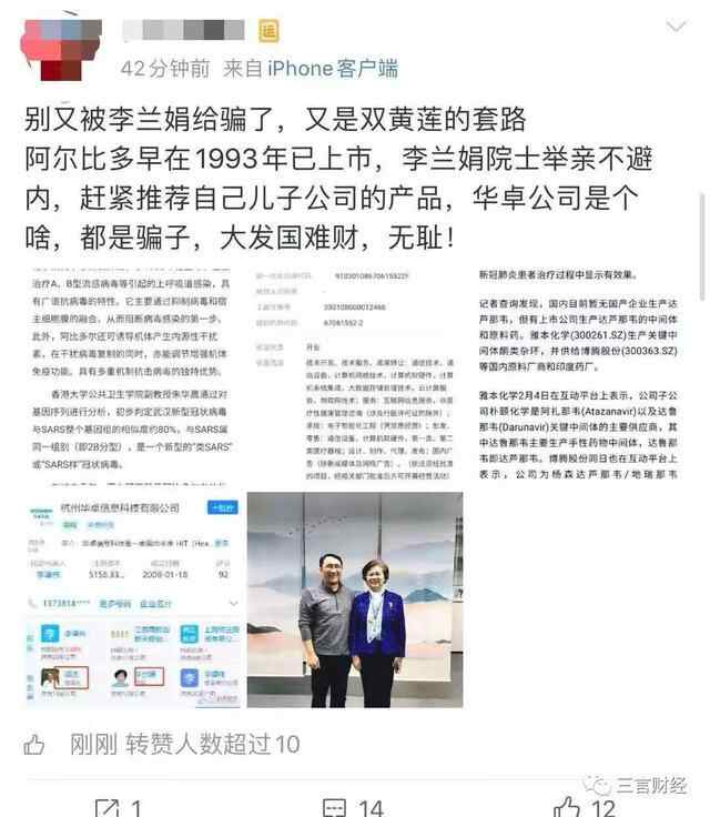近日,在网上流传一篇名为《李兰娟院士重磅推荐新药为其儿子名下公司出品,只经过体外细胞初步测试》的文章,阅读量高达10万+。