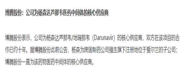 而西安杨森的核心供应商是博腾股份,博腾股份是一家按照国际标准为跨国制药公司和生物制药公司提供医药定制研发生产服务的高新技术企业,主要产品包括叔丁氧侧链、双呋喃内酯、他喷他多侧链和 TBS 酯,均是为商业化阶段的药品定制研发生产的医药中间体。