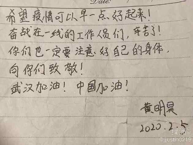 新浪娱乐讯 近日,有网友在社交网站发帖称黄明昊[微博]在日本游玩时感染新型肺炎,引发热议。2月5日,黄明昊在绿洲回应表示:“我很好,大家也都要好好的,都要健康平安。”与此同时,他晒出了手写加油语的照片,向奋战在一线的英雄致敬,并写道“希望疫情可以早一点好起来,武汉加油!中国加油!”(我是弥尔)