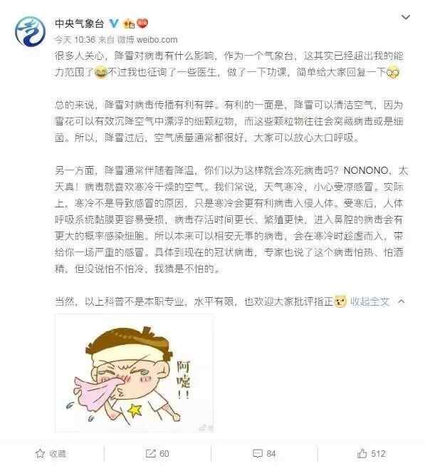 昨天,很多地区降下鼠年首场雪,网上有人说,降雪会抑制病毒传播。中央气象台微博回应称,降雪通常伴随着降温,以为这样就会冻死病毒吗?病毒就喜欢寒冷干燥的空气。