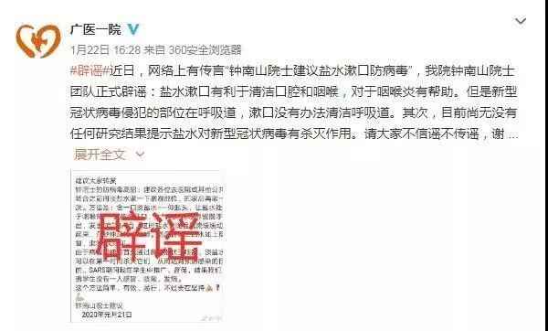 据广州医科大学附属第一医院官方微博消息,近日,网络上有传言“钟南山院士建议盐水漱口防病毒”,钟南山院士团队正式辟谣:盐水漱口有利于清洁口腔和咽喉,对于咽喉炎有帮助,目前尚无任何研究结果提示盐水对病毒有杀灭作用。
