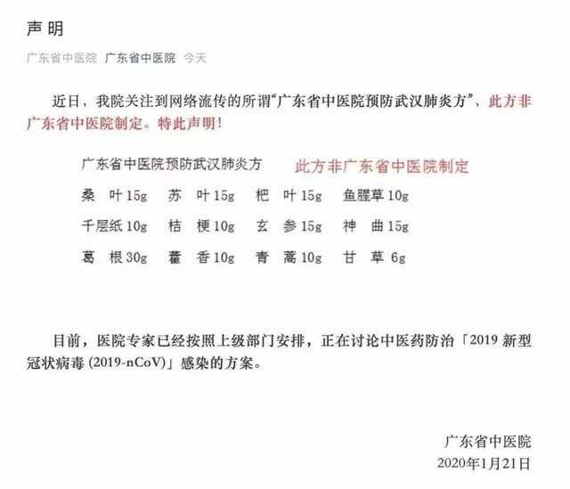 近日一份“广东省中医院预防武汉肺炎方”在微信群里流传,广东省中医院在官方微信发布声明辟谣,称此方非广东省中医院制定。