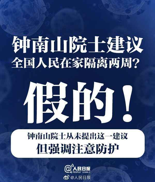 广州医科大学附属第一医院相关负责人表示,钟南山院士从未提出“全中国人民在家隔离两周”的建议。