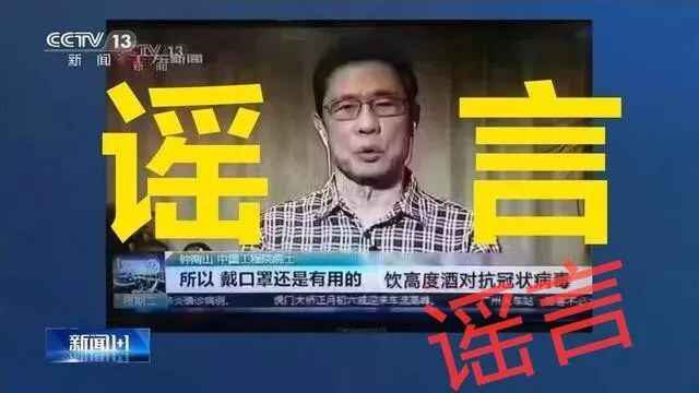 网上疯传的这张图,“饮高度酒对抗冠状病毒”这句话并不是钟南山院士说的,而是有人用作图软件P上去的。