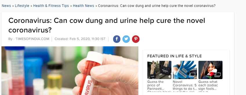 据《印度时报》报道,印度教极端主义政党:印度教大斋会(Akhil Bharatiya Hindu Mahasabha)的主席斯瓦米·查克拉帕尼(Swami Chakrapani)称,牛尿和牛粪可以治愈新型冠状病毒。他说:“食用牛尿和牛粪可以阻止传染性冠状病毒的。不仅如此,斯瓦米·查克拉帕尼甚至说,只有印度的奶牛才能实现这种治疗,尤其是那些不吃街上垃圾的奶牛。他进一步说:“偏头痛或抑郁症等问题也可以通过牛尿/牛粪来治愈。”他还指出人类出现病毒的原因在于人类食用了非素食(吃肉):“食用肉食是所有问题的开始,肉食是所有疾病和负能量的来源。”“如果是新型冠状病毒,患者应该喝牛尿并念诵湿婆咒。在其他情况下,病人可以把牛粪涂在头上或全身便可治愈,这是印度的一种自然疗法。”