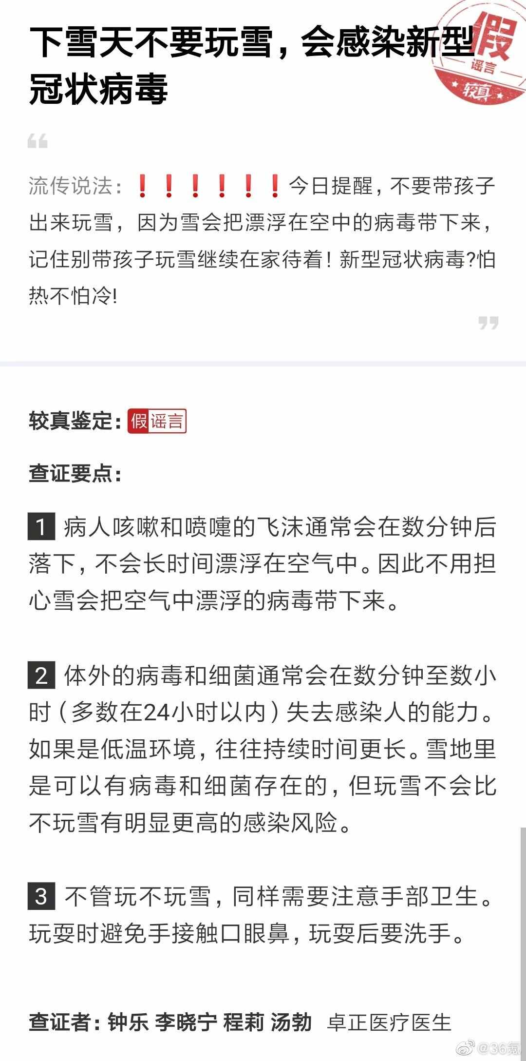 【#疫情辟谣# | 玩雪会感染新型冠状病毒[疑问]】 流传说法:雪会把漂浮在空中的病毒带下来,不能带孩子玩雪。 [思考]...