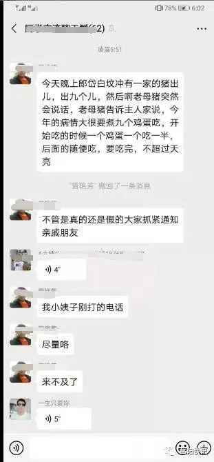 2月5日,有这样一条信息在微信朋友圈广泛传播,信息内容称在郎岱白坟冲有一母猪开口讲话,猪告诉主人要在天亮之前煮九个鸡蛋吃,这样能预疫情。