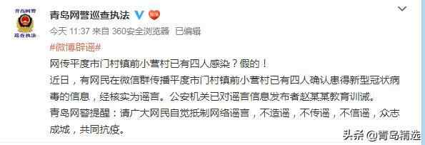 网传平度市门村镇前小营村已有四人感染?假的! 近日,有网民在微信群传播平度市门村镇前小营村已有四人确认患得新型冠状病毒的信息,经核实为谣言。公安机关已对谣言信息发布者赵某某教育训诫。 #青岛爆料# #青岛生活记录# #青岛抗击肺炎日记#