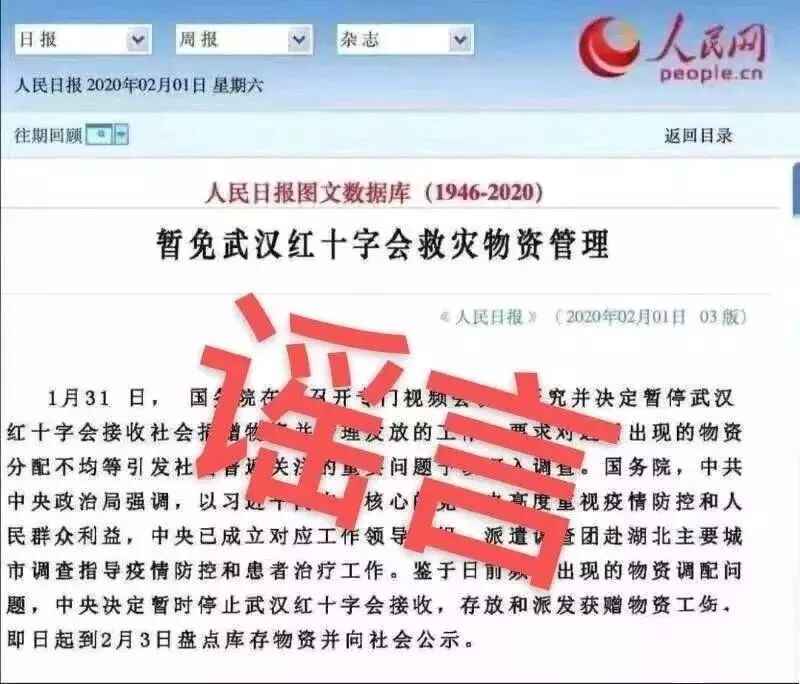 流传版本:《人民日报》:“ 1月31日,国务院在京召开专门视频会议,研究并决定暂停武汉红十字会接收社会捐赠物资并管理发放的工作……”