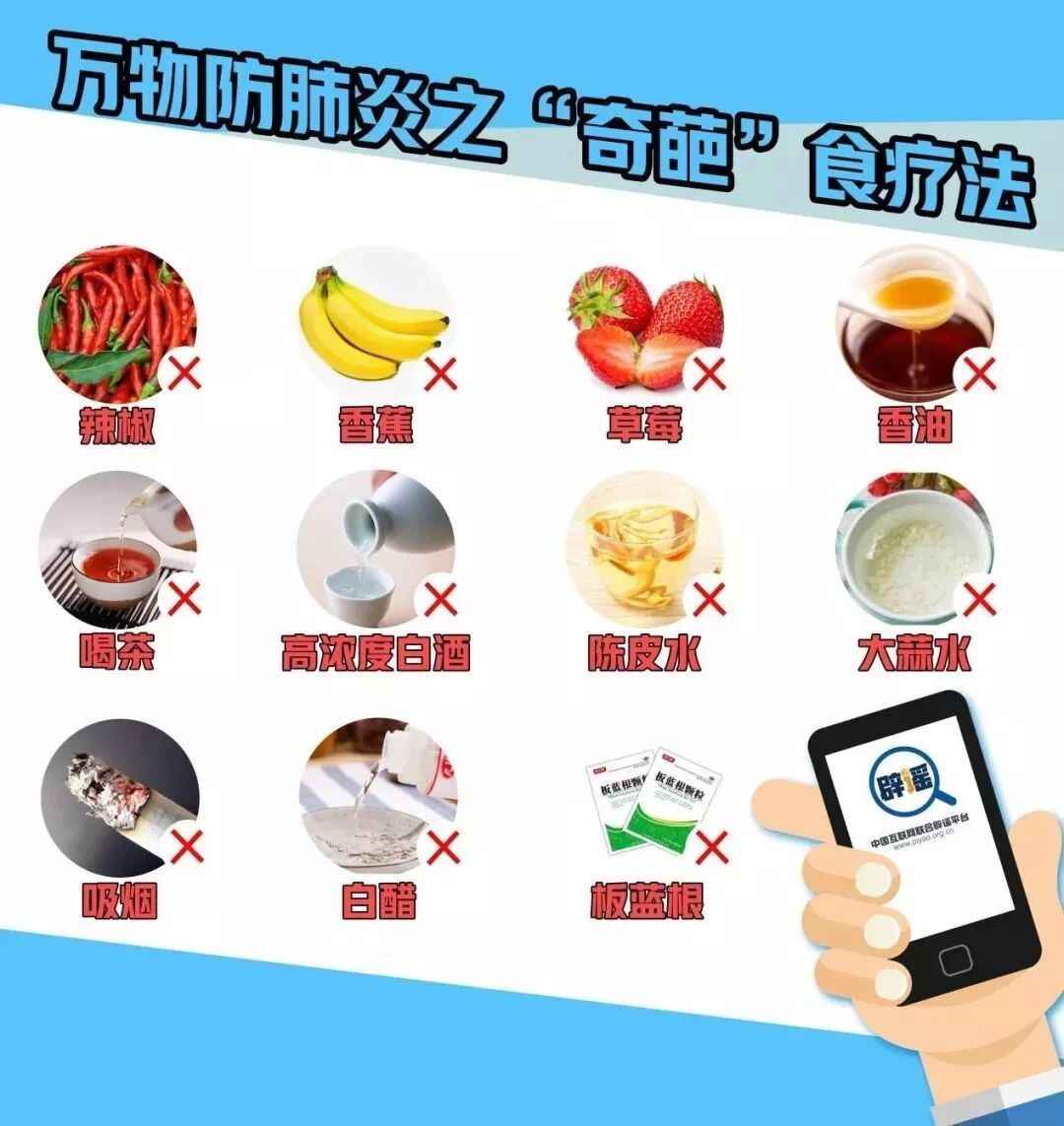 流传版本:吃辣椒、香蕉、草莓、大蒜、喝茶、酒、陈皮水、大蒜水等。流传中多借用“钟南山建议”或是某位营养专家、权威媒体等名号。