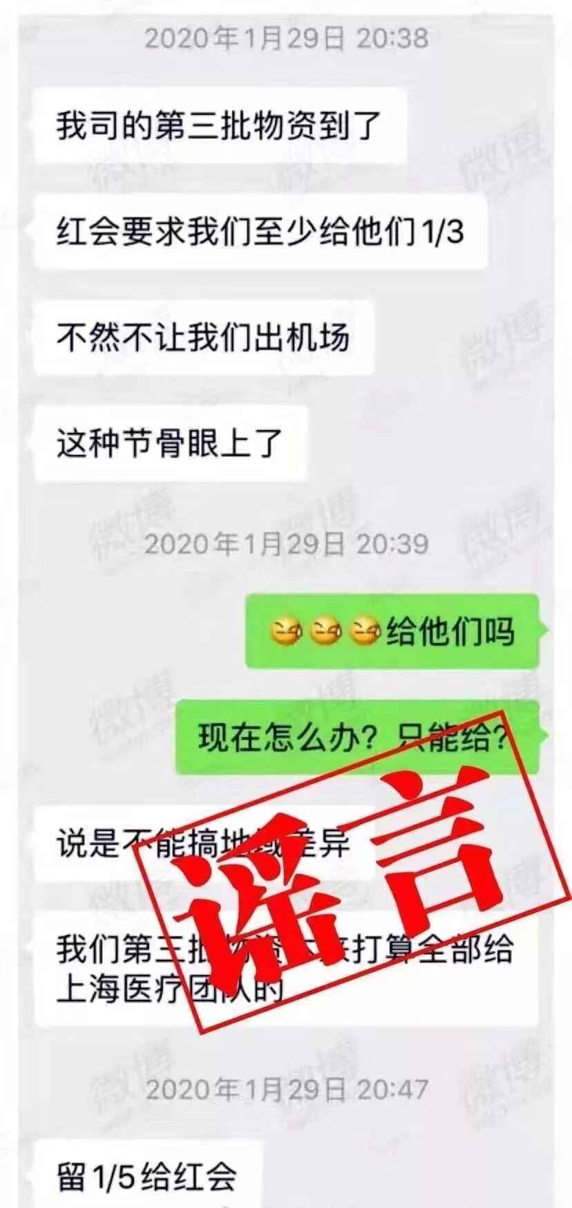 流传版本:“红十字会拦截物资,要求给出一部分的物资才肯放行。”