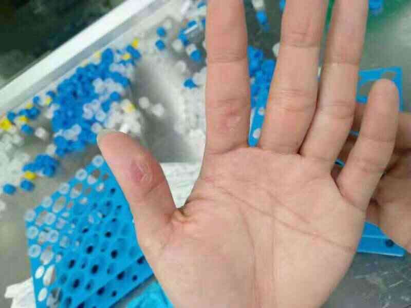 这是一双双曾经握手术刀的手,这些天却在流水线上拧瓶盖、贴标签,把手指都拧起泡、拧破皮。