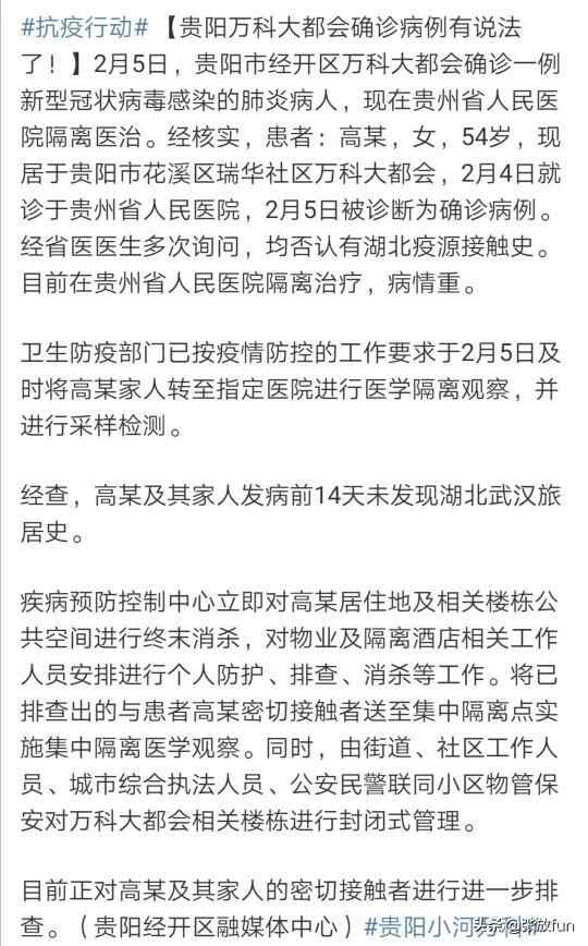 辟谣贵阳万科大都会“毒王”,可我更担心了。之前沸沸扬扬的贵阳小河区“万科老太太”,今天公布说她没有武汉接触史,并且已对楼栋进行消毒。看似是一份辟谣,但实际什么也没说明白, 第一,没有武汉接触史,但确被确诊为新型肺炎患者,那么请问她是怎么感染的,是接触了贵阳的某位患者? 第二,其实大家没那么关心是否有过武汉接触史,更关心的是活动轨迹究竟是哪些地方。因为在网传消息中,更引发人们担心的是活动轨迹。 第三,不必担心公开活动轨迹会引发所谓的恐慌,信息不透明才会恐慌。北京都公开活动轨迹,让大家预防隔离,我们应该跟上首都得步伐。 第四,这次防疫,贵州做得很不错的,工作人员很辛苦,大多数群众都很配合,希望活动轨迹公开能够跟上,让防治做得更好。
