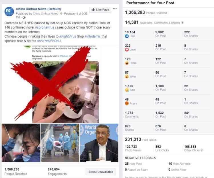我们在脸谱、推特等社交平台发布《蝙蝠汤?人造病毒?特效药?世界主流媒体这样辟谣疫情流言》《可以收来自中国的包裹吗,WHO说没问题!》《世界社交媒体巨头出手遏制疫情谣言》《远离谣言科学防疫:世卫组织推出疫情流言终结者》报道,海外网友广泛关注,浏览量达240万、互动量40万。我们将谣言截屏并以醒目红叉标识,提醒海外网友警惕,获得大量点赞与好评。