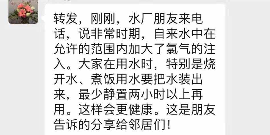 近日,不少青岛人的微信群里在传:“非常时期,自来水中在允许的范围内加大了氯气的注入。大家在用水时,特别是烧开水、煮饭用水要把水装出来,最少静置两小时以上再用。这样会更健康。”
