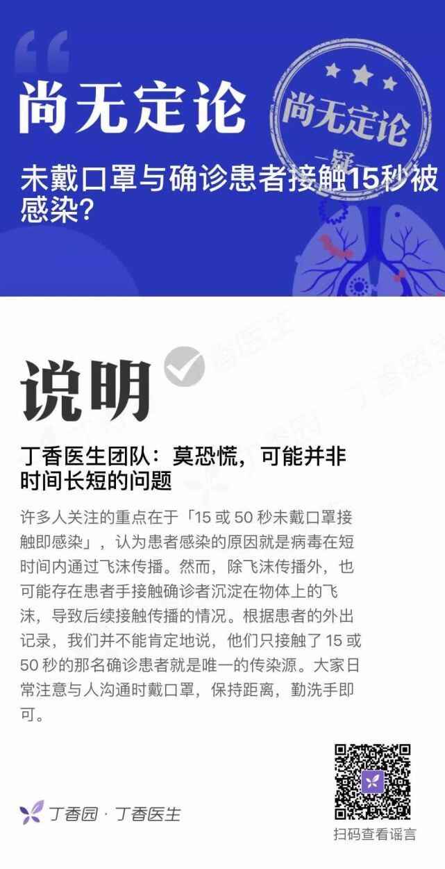 许多人关注的重点在于「15 或 50 秒未戴口罩接触即感染」,认为患者感染的原因就是病毒在短时间内通过飞沫传播。然而,除飞沫传播外,也可能存在患者手接触确诊者沉淀在物体上的飞沫,导致后续接触传播的情况。根据患者的外出记录,我们并不能肯定地说,他们只接触了 15 或 50 秒的那名确诊患者就是唯一的传染源。大家日常注意与人沟通时戴口罩,保持距离,勤洗手即可。