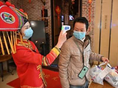 2月6日,广西南宁一家餐饮店内,工作人员为外卖骑手测量体温。美团、饿了么等外卖平台积极响应新型冠状病毒感染的肺炎疫情防控号召,推出“无接触配送”服务,市民在下单后,通过订单备注、打电话等方式与骑手协商商品放置的指定位置,骑手送达后再通知用户自行取餐,减少面对面接触。为保障食品的接触安全及可追踪,外卖平台还与商家合作,在外送食品上配备外卖安心卡,记录餐品制作人、装餐人、骑手的姓名及体温等信息,保障市民和骑手在收餐环节的安全。中新社记者 俞靖 摄