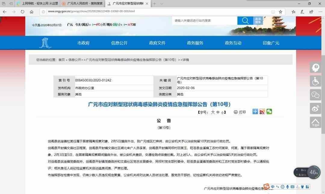 7日,红星新闻记者获悉,6日,广元市应对新型冠状病毒感染肺炎疫情应急指挥部发布了第10号公告:剑阁县武连镇杜某任属于居家隔离观察对象,2月5日擅自外出,到广元城区打麻将,由公安机关予以治安拘留10天的治安行政处罚。