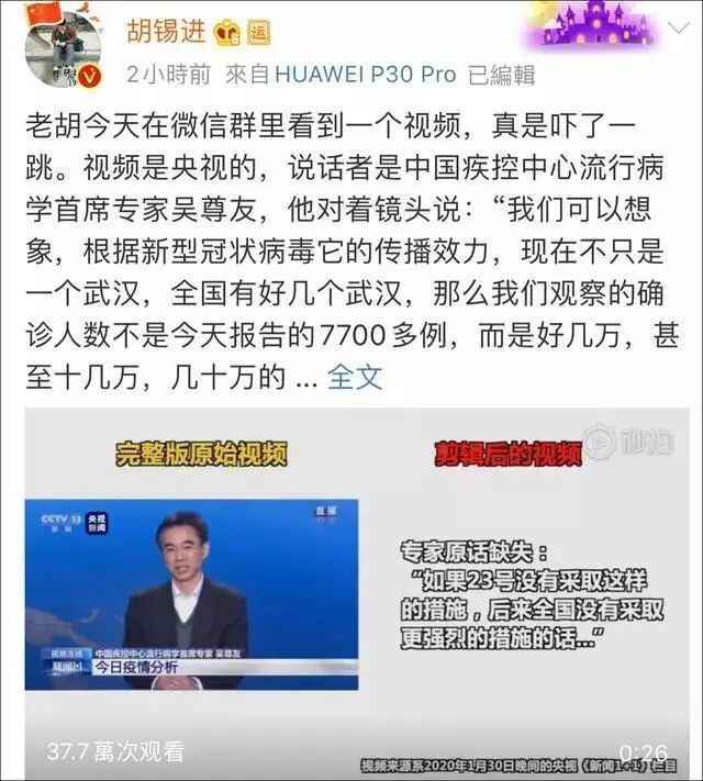 网上流传着一则央视的视频,中国疾控中心流行病学首席专家吴尊友对着着镜头说:“我们可以想象,根据新型冠状病毒它的传播效力,现在不只是一个武汉,全国有好几个武汉,那么我们观察的确诊人数不是今天报告的7700多例,而是好几万,甚至十几万,几十万的病例。”