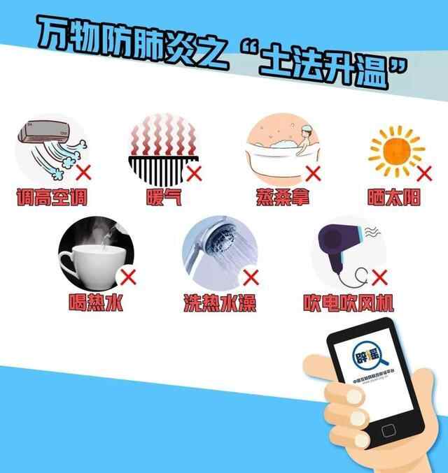 流传版本:调高空调温度、蒸桑拿、晒太阳等,流传中多借用“钟南山建议”等防疫专家的名号。