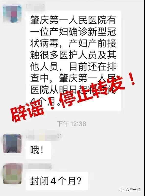 近日,记者发现有市民通过互联网和朋友圈发布“肇庆第一人民医院有一位产妇确诊新型冠状病毒,产妇产前接触很多医护人员及其他人员,目前还在排查中,肇庆第一人民医院从明日起将封闭4个月。”“第14例现在在第一人民医院ICU,封开的医护人员已经需要隔离,第一医院的也要,接触他的183人。”等信息。记者从肇庆市第一人民医院获悉,以上消息皆为不实信息。
