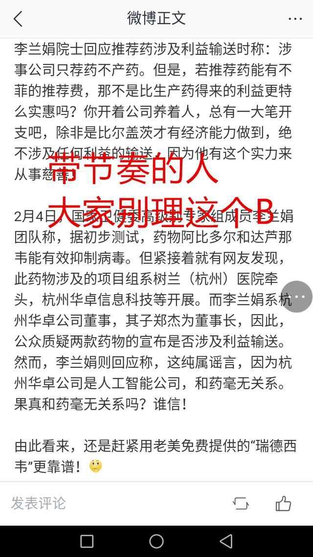 别管那些谣言,您是值得尊敬的人——致敬李兰娟 在“新型肺炎”肆虐之际,许多人十分关注钟南山院士发表的言论,但除了钟老,还有一位奋战在防疫一线的老人,也值得我们尊敬——李兰娟。 2月1日,在李兰娟院士的带领下,树兰(杭州)医院紧急医疗队紧急驰援武汉。 2003年“非典”时期,身为浙江省卫生厅厅长的李兰娟,采取超常措施应对“非典”,并首先分离出SARS病毒并完成基因测序。 最终,浙江省非典发病病例只有4例,死亡1例。 她当年采取的应对手段,后来成为了防控传染病的标准程序。 面对“新型肺炎”,李兰娟又是第一个提出武汉封城的人。 可以相像,如果之前没有采取这样的措施,全国疫情蔓延形势将格外严峻。 如今73岁的她,带领团队投入冲在一线,每天睡眠时间只有3个小时! 2月4日,李兰娟发布重大抗病毒研究成果(阿比朵尔、达芦那韦能有效抑制新型冠状病毒),却被某公众号恶意诋毁,其发布文章的标题为:《李兰娟院士重磅推荐新药为其儿子名下公司出口,只经过体外细胞初步测试》。 大意是质疑李兰娟宣布的内容涉及利益输送。 但实际情况是,以上两种药和“杭州华卓信息”完全无关,并且该公司本身和药品研发也没有任何关系,该文章纯属造谣。 李兰娟本人也回应媒体,表示杭州华卓公司是人工智能公司,和药毫无关系。 事后,该公众号的文章已被删除,却仍有人不断地在网上“带节奏”,真可谓居心叵测。 勒庞在《乌合之众》一书中写道: 在群集情况下,个体放弃独立批判的思考能力,而让群体的精神代替自己的精神,进而放弃了责任意识乃至各种约束,最有理性的人也会像动物一样行动。 本应共渡难关之时,却有那么多“乌合之众”喜欢不负责任地畅所欲言,实在想不明白,这些人的背后是否有“利益输送”? 李院士加油,相信您能攻克一个又一个的难题,让谣言不攻自破! 最后分享一幅网上的对联: 上联:火神山,雷神山,钟南山,三山齐聚克难关 下联:国内捐,海外捐,李兰娟,众捐纷来达能途 横批:共渡难关 #头条情感学院#