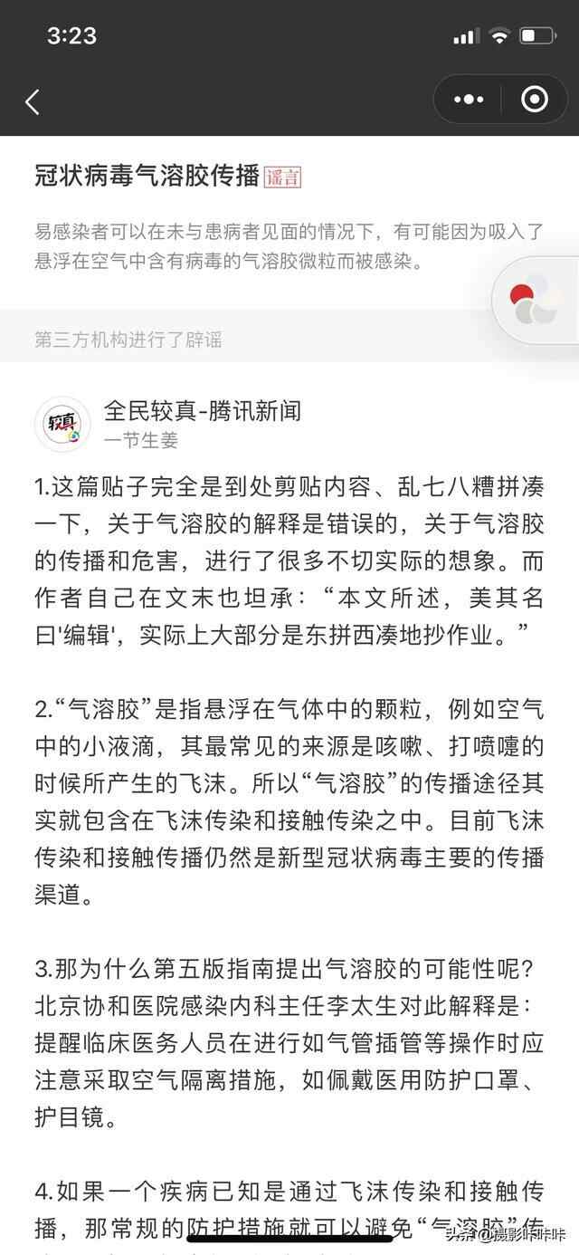 关于气溶胶方式传播,微信辟谣需要及时更新呀!#疫情辟谣# #新型冠状病毒肺炎#