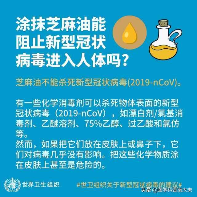 芝麻油不能杀死新型冠状病毒(2019-nCoV)。