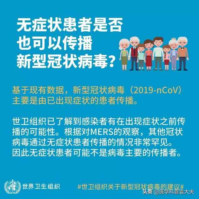 基于现有数据,新型冠状病毒(2019-nCoV)主要是由已出现症状的患者传播。世卫组织已了解到感染者有在出现症状之前传播的可能性。根据对MERS(中东呼吸综合症)的观察,其他冠状病毒通过无症状患者传播的情况非常罕见。因此,无症状患者可能不是病毒主要的传播者。