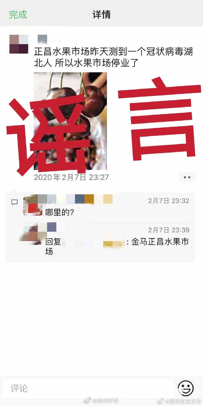 #疫情辟谣# [话筒][话筒]近日, 网络上流传一则信息称:“正昌水果市场昨天测到一个新型冠状病毒湖北人 所以水果市场停...