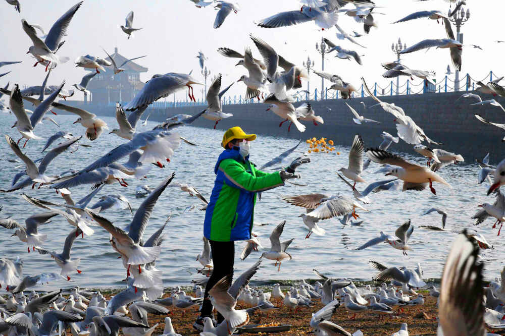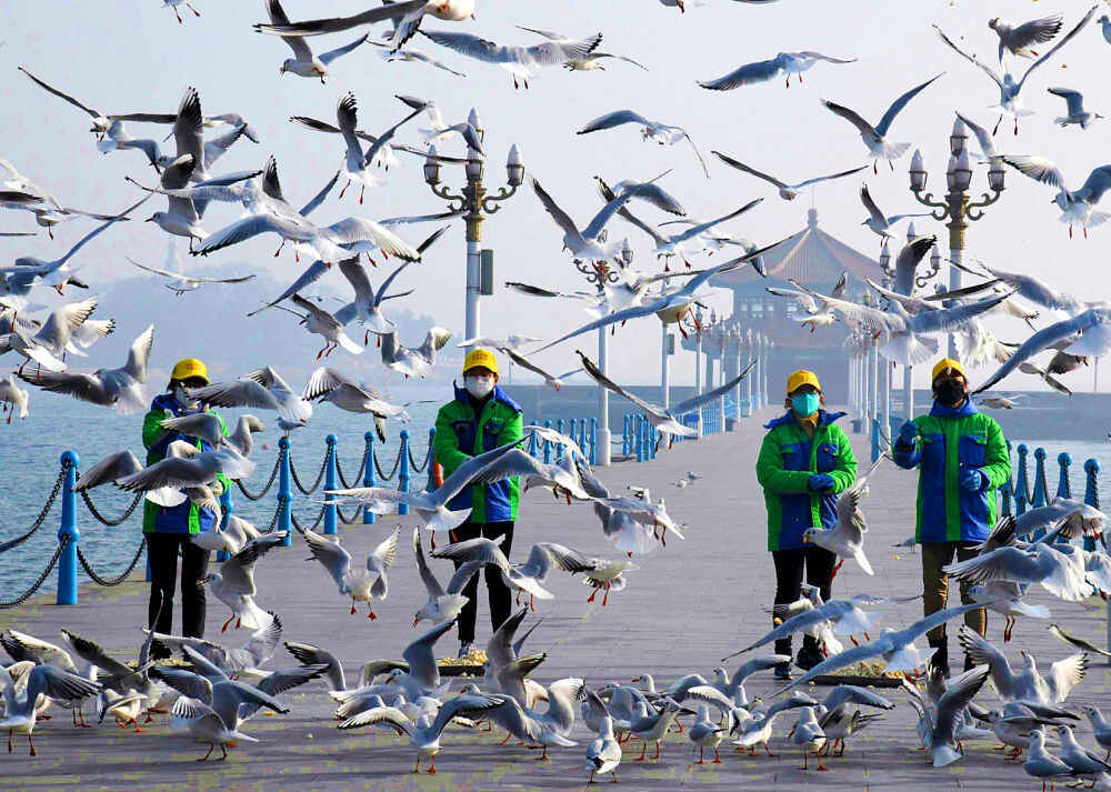 2月10日,“海鸥饲养员”在栈桥上喂食海鸥。(新华社记者 李紫恒摄)