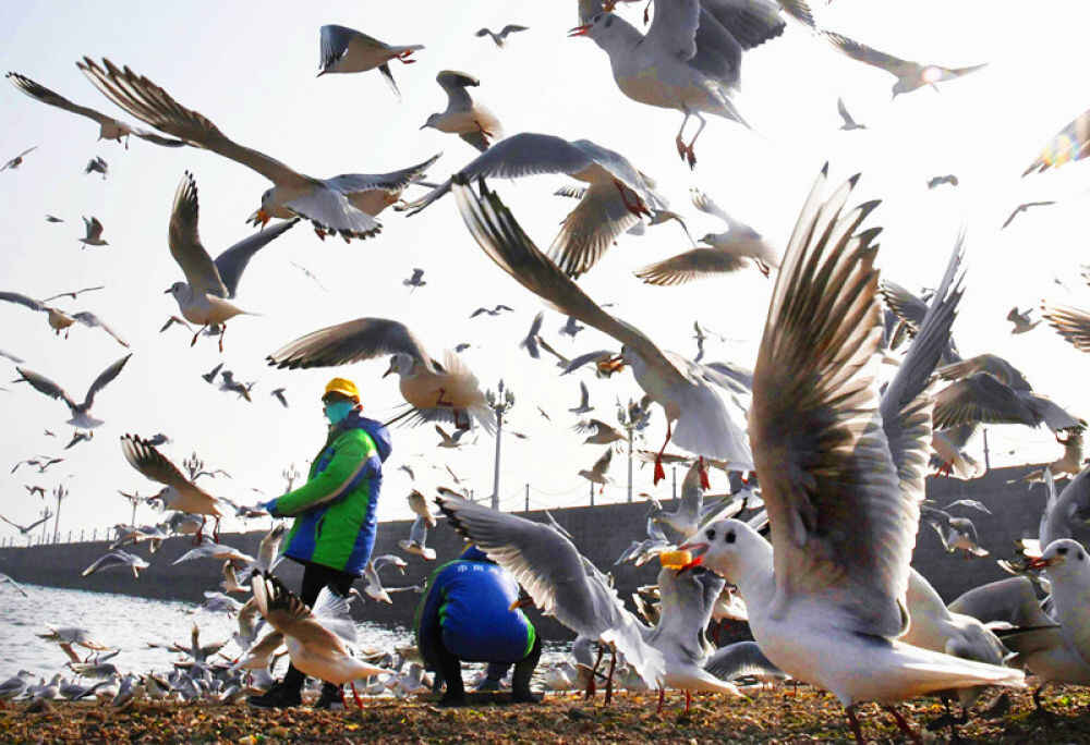 2月10日,“海鸥饲养员”在喂食海鸥。(新华社记者 李紫恒摄)