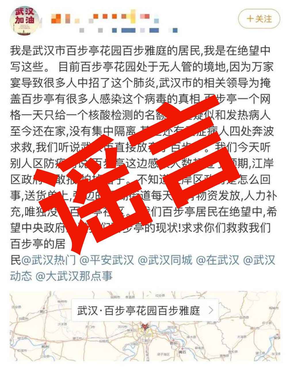 经武汉市防疫指挥部核查回复:此为谣言。据悉,疫情防控工作启动以来,武汉江岸区百步亭社区以网格化管理为基准,统筹区税务局下沉干部、网格员、社区民警、物业人员、志愿者等力量组成工作团队,分片包干,全面摸排近4万户居民体温。对确诊人员、疑似人员和密切接触人员分别送定点医院、方舱医院和隔离点,发热人员实行居家隔离,对密切接触者实行严密监测。对居家隔离人员、困难家庭,空巢老人送医送药送菜,提供必要的生活物资保障。物业每天固定对社区进行两次全面消杀。