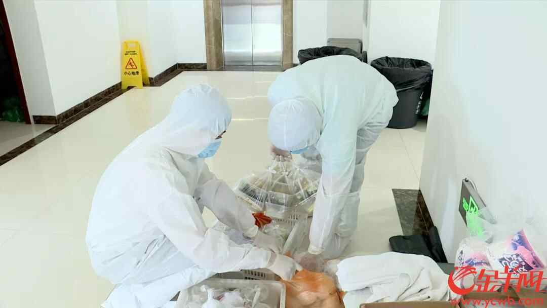 饭菜送来后,刘健接过装满饭菜的塑料筐。记者发现,饭菜的重量让刘健半边身体都倾斜了。一层一层、一间一间,刘健将午餐送到每一位观察者的房门口,并轻轻敲门,提醒饭菜送到。还没送完一层,额头已隐约能看到汗水。刘健告诉记者,他和一名同事负责小瀛洲这边的送餐,每餐需要送70多份,每天早中午三餐,每个人要送100多份。由于隔离区的楼房没有电梯,也不能用电梯,他们只能一层层地走楼梯。