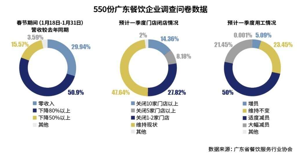 2月4日,广东省餐饮服务行业协会发布了一份《广东餐饮企业受疫情影响调查问卷》,在几个小时内收回了550份餐饮企业答卷。