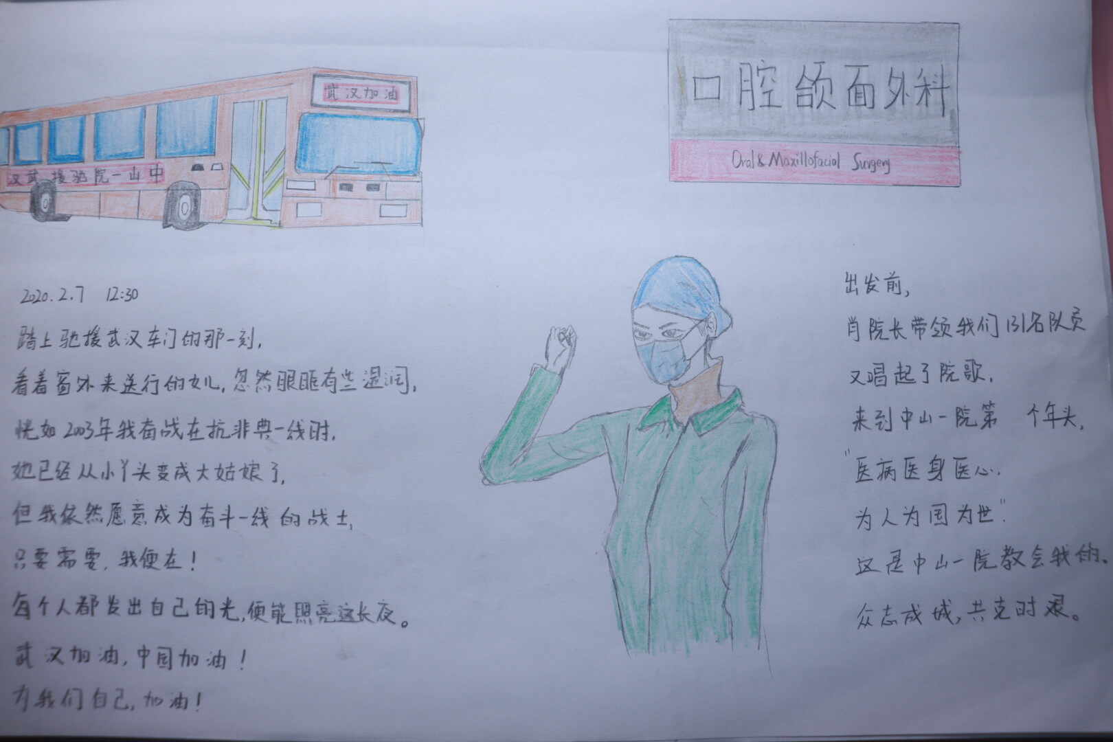 今天是我来到武汉的第7天,下班后无论多么累,看看可爱的同事为我画的那一张张漫画就特别暖心又解压。这是我在中山一院口腔颌面外科工作的第32个年头,在听闻医院要组建驰援武汉医疗队后,我第一个向护长报了名。很快,第一批特战队员的名单出来了,没有我的名字,心里有些失落,但我无条件服从医院的决定,继续学习新型肺炎的知识及医务人员防护措施等。